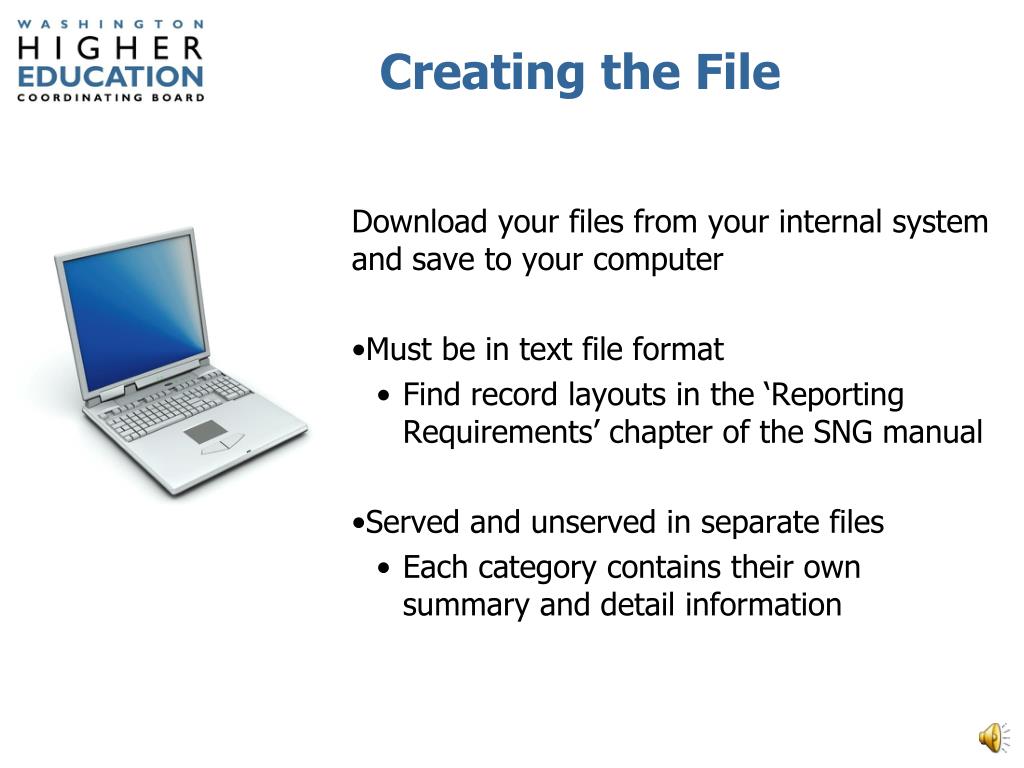 Creating the File • Download your files from your internal system and save to your computer • Must be in text file format • Find record layouts in the ‘Reporting Requirements’ chapter of the SNG manual • Served and unserved in separate files • Each category contains their own summary and detail information