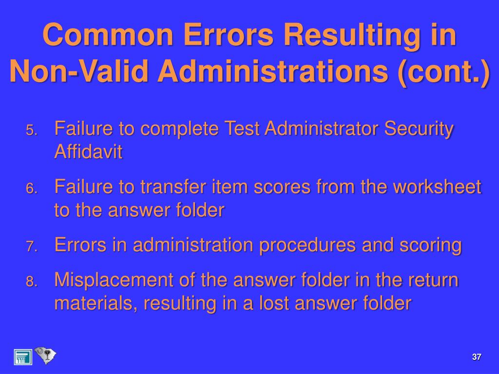 Common Errors Resulting inNon-Valid Administrations (cont.) • Failure to complete Test Administrator Security Affidavit • Failure to transfer item scores from the worksheet to the answer folder • Errors in administration procedures and scoring • Misplacement of the answer folder in the return materials, resulting in a lost answer folder