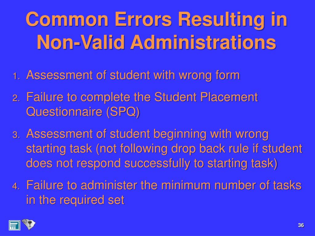 Common Errors Resulting in Non-Valid Administrations • Assessment of student with wrong form • Failure to complete the Student Placement Questionnaire (SPQ) • Assessment of student beginning with wrong starting task (not following drop back rule if student does not respond successfully to starting task) • Failure to administer the minimum number of tasks in the required set