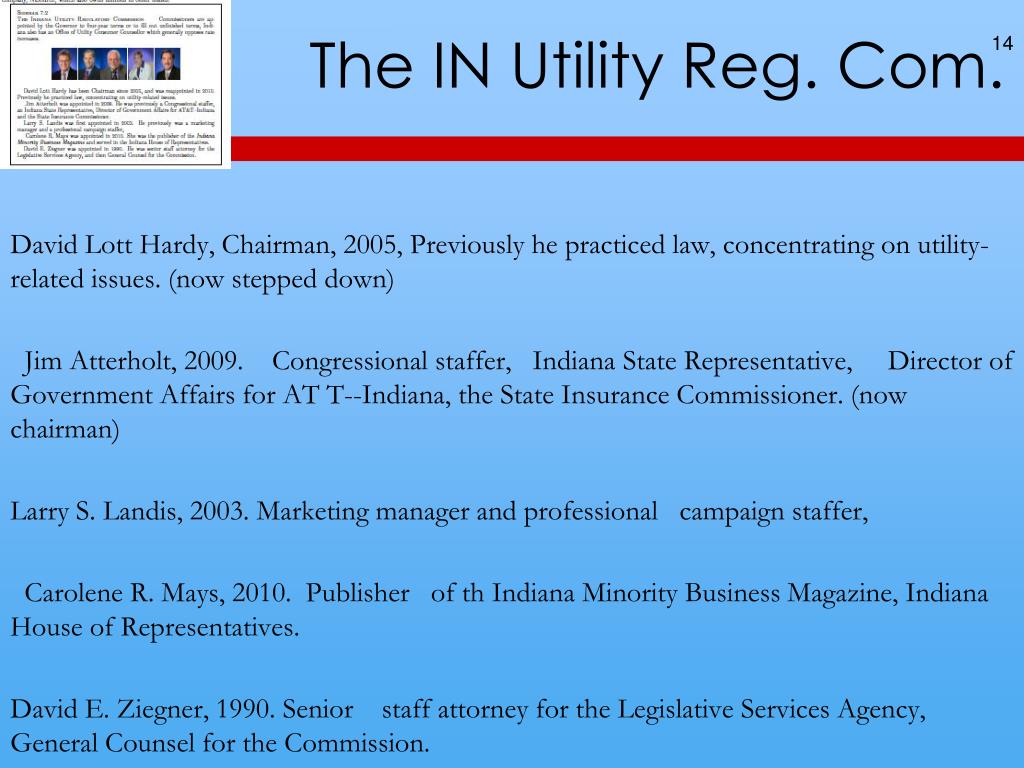 The IN Utility Reg. Com. David Lott Hardy, Chairman, 2005, Previously he practiced law, concentrating on utility-related issues. (now stepped down) Jim Atterholt, 2009. Congressional staffer, Indiana State Representative, Director of Government Affairs for AT T--Indiana, the State Insurance Commissioner. (now chairman) Larry S. Landis, 2003. Marketing manager and professional campaign staffer, Carolene R. Mays, 2010. Publisher of th Indiana Minority Business Magazine, Indiana House of Representatives. David E. Ziegner, 1990. Senior staff attorney for the Legislative Services Agency, General Counsel for the Commission.