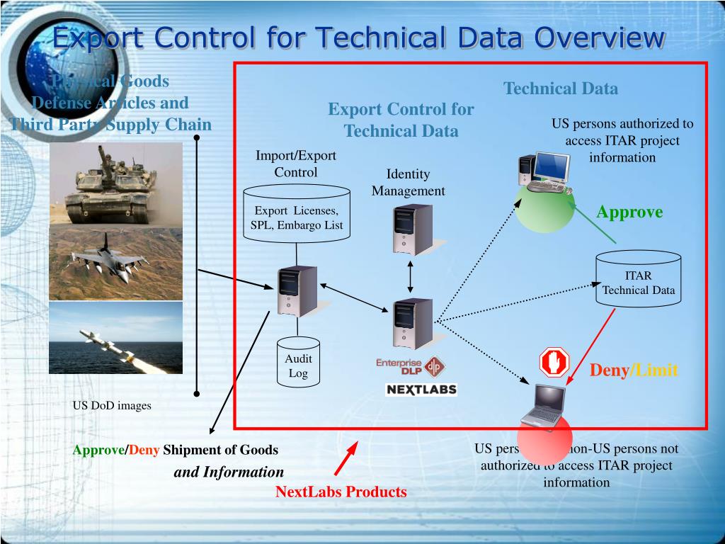 Technical Data US persons authorized to access ITAR project information IdentityManagement ITAR Technical Data US persons and non-US persons not authorized to access ITAR project information Approve/Deny Shipment of Goods Export Control for Technical Data Overview Physical Goods Defense Articles and Third Party Supply Chain Export Control forTechnical Data Import/Export Control Export Licenses,SPL, Embargo List Approve Audit Log Deny/Limit US DoD images and Information NextLabs Products
