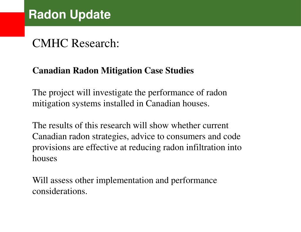 Radon Update CMHC Research: Canadian Radon Mitigation Case Studies The project will investigate the performance of radon mitigation systems installed in Canadian houses. The results of this research will show whether current Canadian radon strategies, advice to consumers and code provisions are effective at reducing radon infiltration into houses Will assess other implementation and performance considerations.