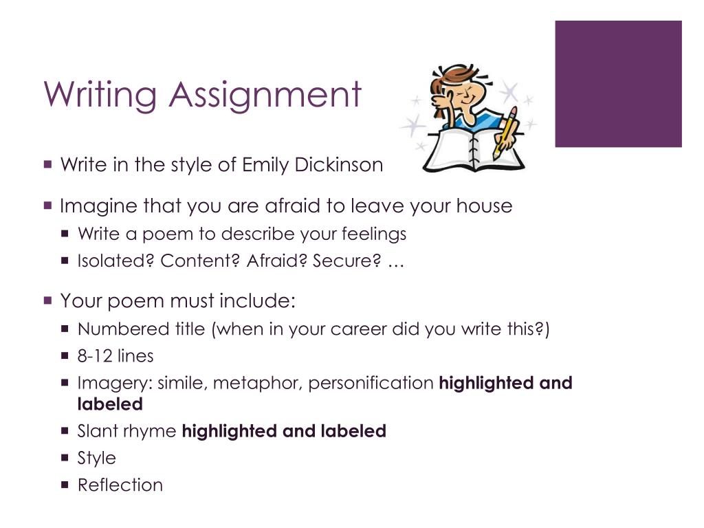 Writing Assignment • Write in the style of Emily Dickinson • Imagine that you are afraid to leave your house • Write a poem to describe your feelings • Isolated? Content? Afraid? Secure? … • Your poem must include: • Numbered title (when in your career did you write this?) • 8-12 lines • Imagery: simile, metaphor, personification highlighted and labeled • Slant rhyme highlighted and labeled • Style • Reflection