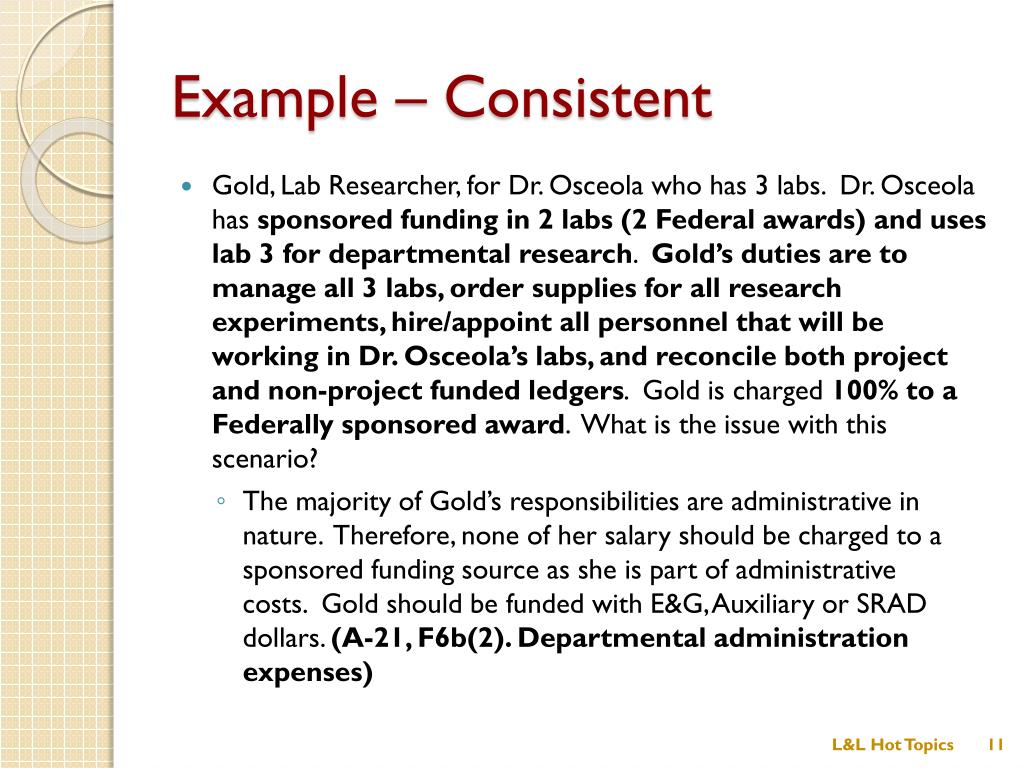 Example – Consistent • Gold, Lab Researcher, for Dr. Osceola who has 3 labs. Dr. Osceola has sponsored funding in 2 labs (2 Federal awards) and uses lab 3 for departmental research. Gold’s duties are to manage all 3 labs, order supplies for all research experiments, hire/appoint all personnel that will be working in Dr. Osceola’s labs, and reconcile both project and non-project funded ledgers. Gold is charged 100% to a Federally sponsored award. What is the issue with this scenario? • The majority of Gold’s responsibilities are administrative in nature. Therefore, none of her salary should be charged to a sponsored funding source as she is part of administrative costs. Gold should be funded with E&G, Auxiliary or SRAD dollars. (A-21, F6b(2). Departmental administration expenses) L&L Hot Topics