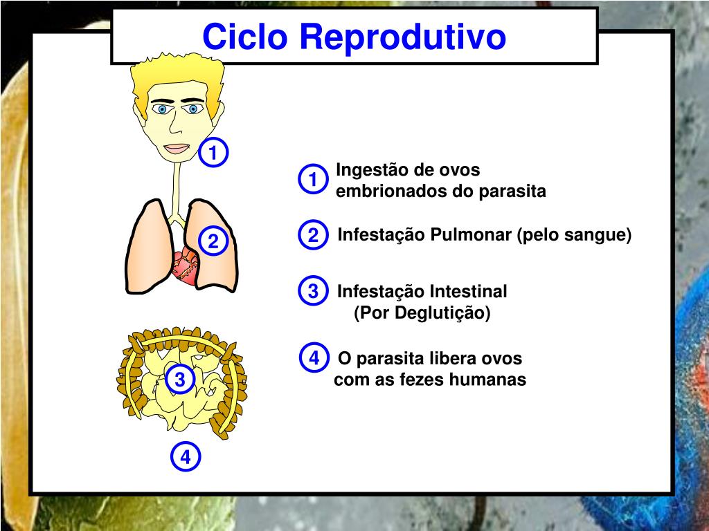 Ciclo Reprodutivo 1 Ingestão de ovos embrionados do parasita 1 Infestação Pulmonar (pelo sangue) 2 2 3 Infestação Intestinal (Por Deglutição) 4 O parasita libera ovos com as fezes humanas 3 4