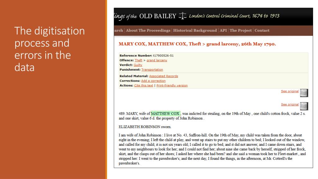 Visualising the Old Bailey Proceedings as a Digital Panopticon Dataset. Richard Ward Research associate, digital Panopticon project 14 April 2014 Richard.ward@Sheffield.ac.uk. Research questions . 1. The original records data collection in the eighteenth and nineteenth centuries
