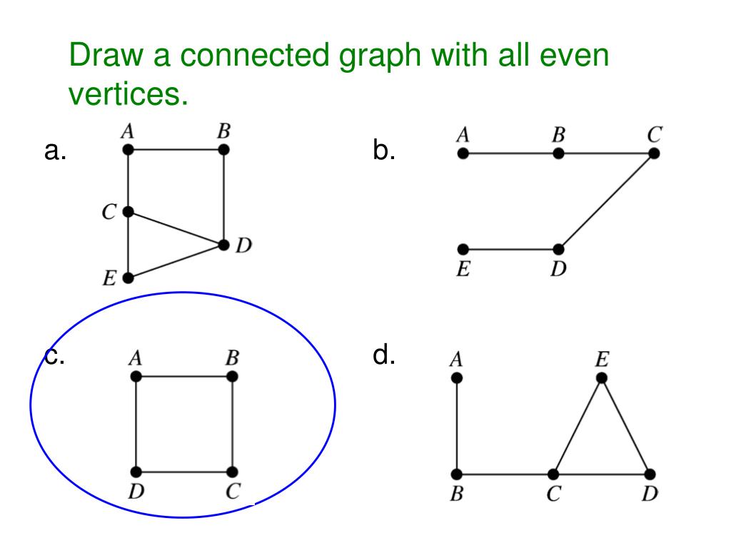 A path is a sequence of adjacent vertices and edges connecting them. C, D, A, B is an example of a path. A circuit is a path that begins and ends at the same vertex. A, C, B, D, A forms a circuit. B B A A E E D D C C Definitions