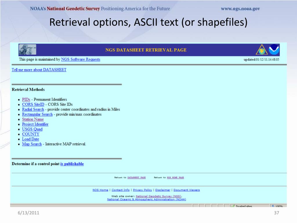 Visualization of NGS Geodetic Control • CA Geodetic Advisor Resources (CGAR) website, hosted by CT Office of Land Surveys webpage http://www.dot.ca.gov/hq/row/landsurveys/geodetic • Google Earth kmls • Google Maps online • Shapefiles • DSWorld, NGS partner software (shows ALL control; doesn’t symbolize VERTCON differently)