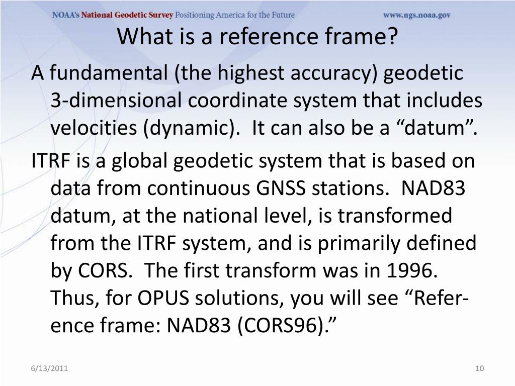 What is a reference frame? A fundamental (the highest accuracy) geodetic 3-dimensional coordinate system that includes velocities (dynamic). It can also be a “datum”. ITRF is a global geodetic system that is based on data from continuous GNSS stations. NAD83 datum, at the national level, is transformed from the ITRF system, and is primarily defined by CORS. The first transform was in 1996. Thus, for OPUS solutions, you will see “Refer-ence frame: NAD83 (CORS96).”