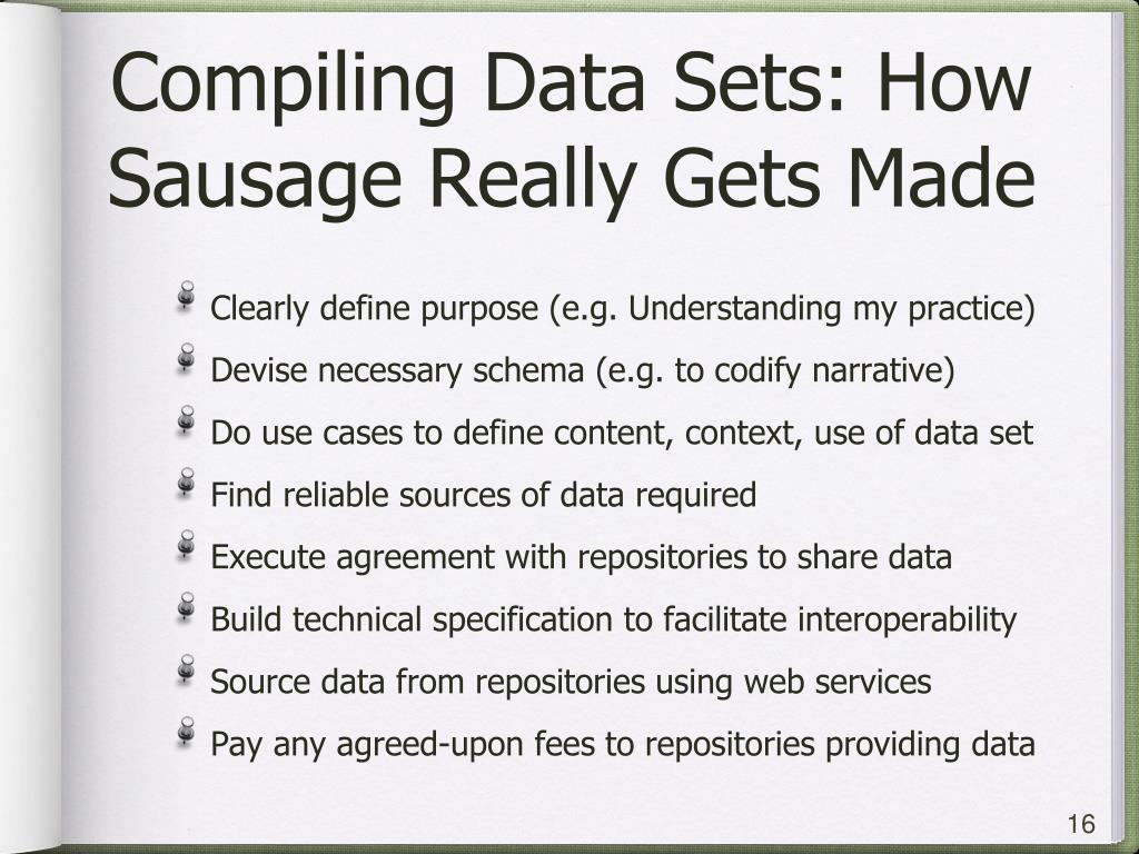 Compiling Data Sets: How Sausage Really Gets Made • Clearly define purpose (e.g. Understanding my practice) • Devise necessary schema (e.g. to codify narrative) • Do use cases to define content, context, use of data set • Find reliable sources of data required • Execute agreement with repositories to share data • Build technical specification to facilitate interoperability • Source data from repositories using web services • Pay any agreed-upon fees to repositories providing data