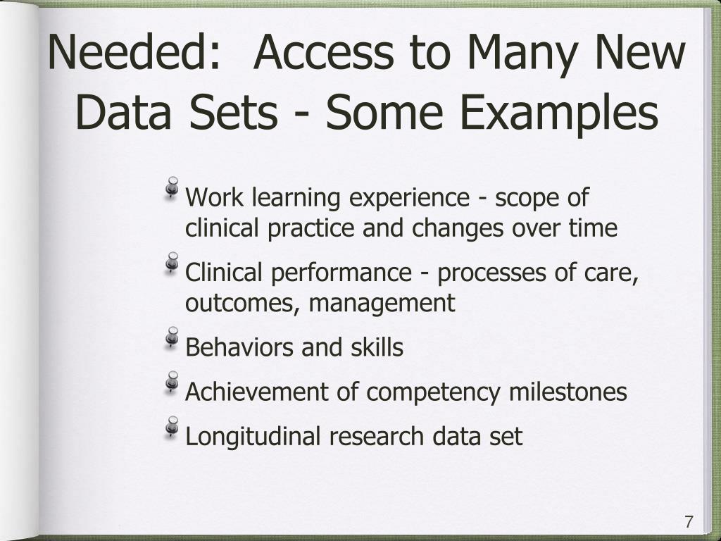 Needed: Access to Many New DataSets - Some Examples • Work learning experience - scope of clinical practice and changes over time • Clinical performance - processes of care, outcomes, management • Behaviors and skills • Achievement of competency milestones • Longitudinal research data set