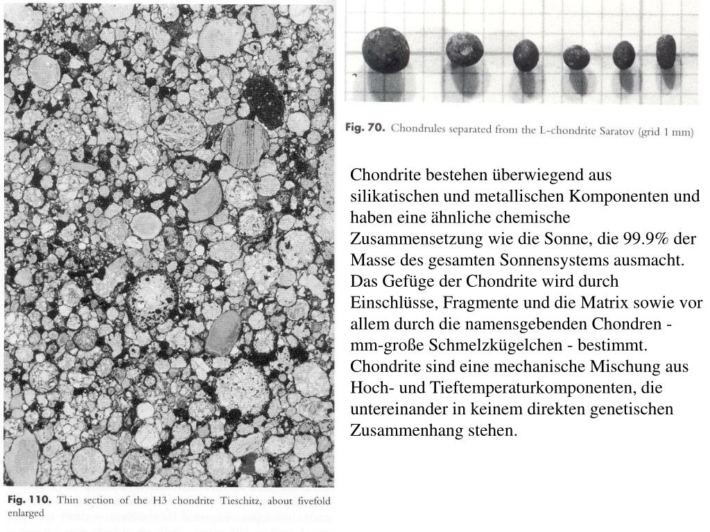 Chondrite bestehen überwiegend aus silikatischen und metallischen Komponenten und haben eine ähnliche chemische Zusammensetzung wie die Sonne, die 99.9% der Masse des gesamten Sonnensystems ausmacht. Das Gefüge der Chondrite wird durch Einschlüsse, Fragmente und die Matrix sowie vor allem durch die namensgebenden Chondren - mm-große Schmelzkügelchen - bestimmt. Chondrite sind eine mechanische Mischung aus Hoch- und Tieftemperaturkomponenten, die untereinander in keinem direkten genetischen Zusammenhang stehen.