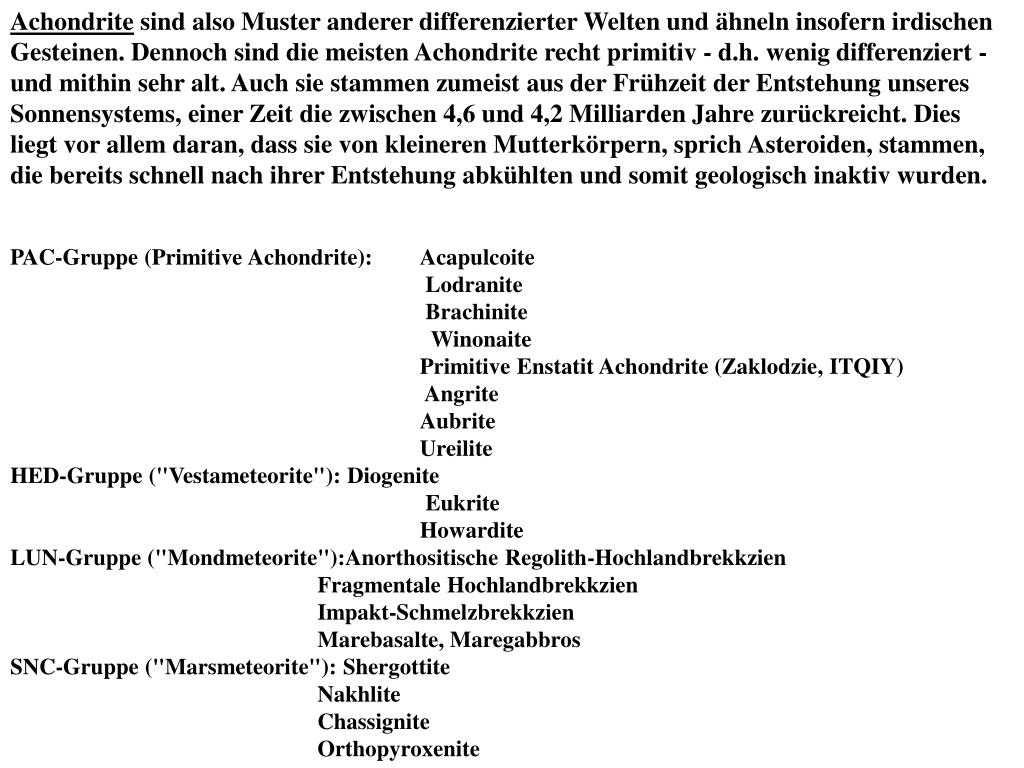 Achondrite sind also Muster anderer differenzierter Welten und ähneln insofern irdischen Gesteinen. Dennoch sind die meisten Achondrite recht primitiv - d.h. wenig differenziert - und mithin sehr alt. Auch sie stammen zumeist aus der Frühzeit der Entstehung unseres Sonnensystems, einer Zeit die zwischen 4,6 und 4,2 Milliarden Jahre zurückreicht. Dies liegt vor allem daran, dass sie von kleineren Mutterkörpern, sprich Asteroiden, stammen, die bereits schnell nach ihrer Entstehung abkühlten und somit geologisch inaktiv wurden. PAC-Gruppe (Primitive Achondrite): Acapulcoite Lodranite Brachinite Winonaite Primitive Enstatit Achondrite (Zaklodzie, ITQIY) Angrite Aubrite Ureilite HED-Gruppe ("Vestameteorite"): Diogenite Eukrite Howardite LUN-Gruppe ("Mondmeteorite"):Anorthositische Regolith-Hochlandbrekkzien Fragmentale Hochlandbrekkzien Impakt-Schmelzbrekkzien Marebasalte, Maregabbros SNC-Gruppe ("Marsmeteorite"): Shergottite Nakhlite Chassignite Orthopyroxenite
