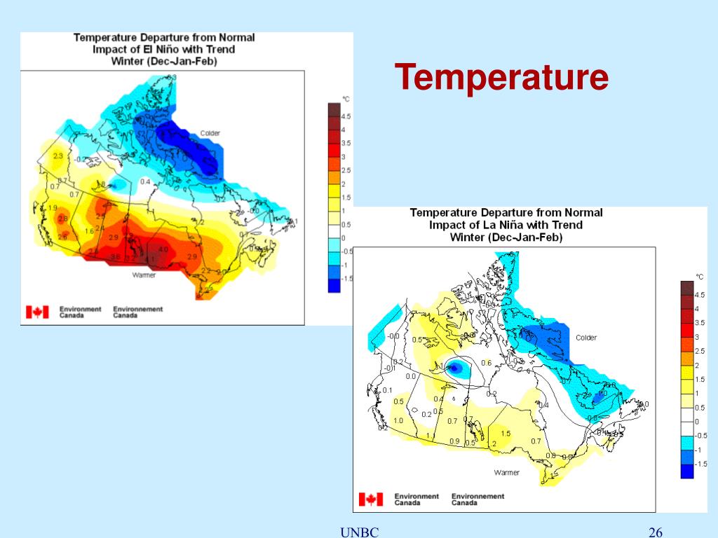 Significant impacts of ENSO on Canadian natural resources and environment have been documented in a variety of areas including water resources, agriculture, forestry, fisheries, power utilities, coastal zones and other climate sensitive sectors of the Canadian economy. (1)the fishery of British Columbia. (2) forestry … Hsieh and Tang, 2001. Interannual variability of accumulated snow in the Columbia basin, British Columbia. Water Resources Res. 37: 1753-1760. Hsieh, W.W., B. Tang and E.R. Garnett, 1999. Teleconnections between Pacific sea surface temperatures and Canadian prairie wheat yield. Agricul. Forest Meteorol. 96: 209-217. UNBC