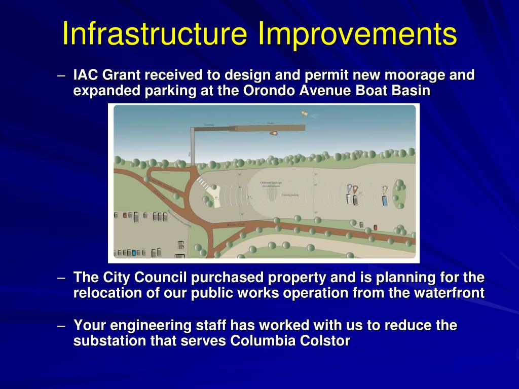 Infrastructure Improvements • IAC Grant received to design and permit new moorage and expanded parking at the Orondo Avenue Boat Basin • The City Council purchased property and is planning for the relocation of our public works operation from the waterfront • Your engineering staff has worked with us to reduce the substation that serves Columbia Colstor