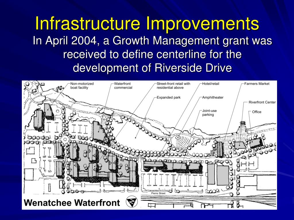 Infrastructure Improvements In April 2004, a Growth Management grant was received to define centerline for the development of Riverside Drive