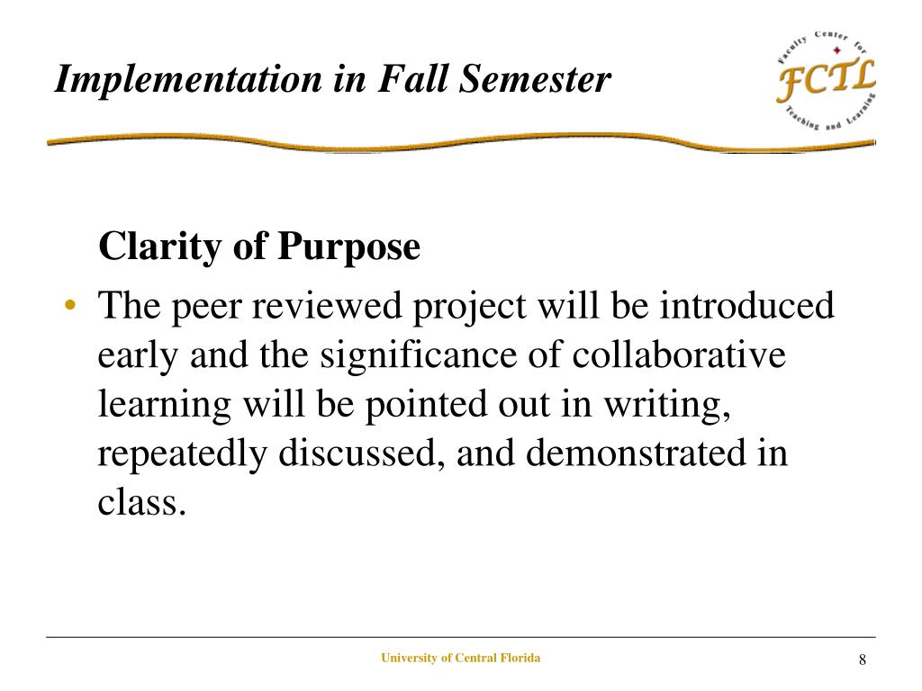 Implementation in Fall Semester Clarity of Purpose • The peer reviewed project will be introduced early and the significance of collaborative learning will be pointed out in writing, repeatedly discussed, and demonstrated in class. University of Central Florida