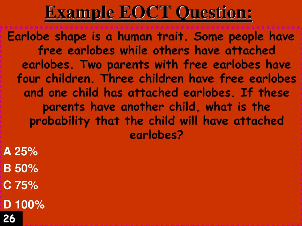 Example EOCT Question: Earlobe shape is a human trait. Some people have free earlobes while others have attached earlobes. Two parents with free earlobes have four children. Three children have free earlobes and one child has attached earlobes. If these parents have another child, what is the probability that the child will have attached earlobes? A 25% B 50% C 75% D 100% 26