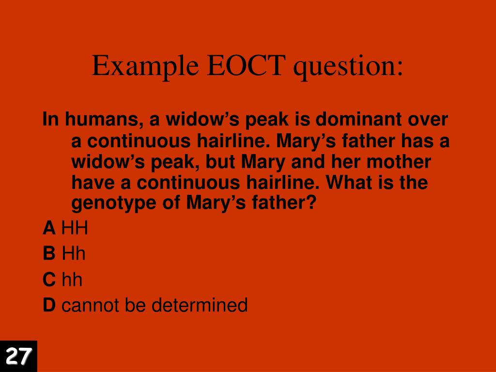 Example EOCT question: In humans, a widow’s peak isdominant over a continuous hairline. Mary’s father has a widow’s peak, but Mary and her mother have a continuous hairline. What is the genotype of Mary’s father? A HH B Hh C hh D cannot be determined 27