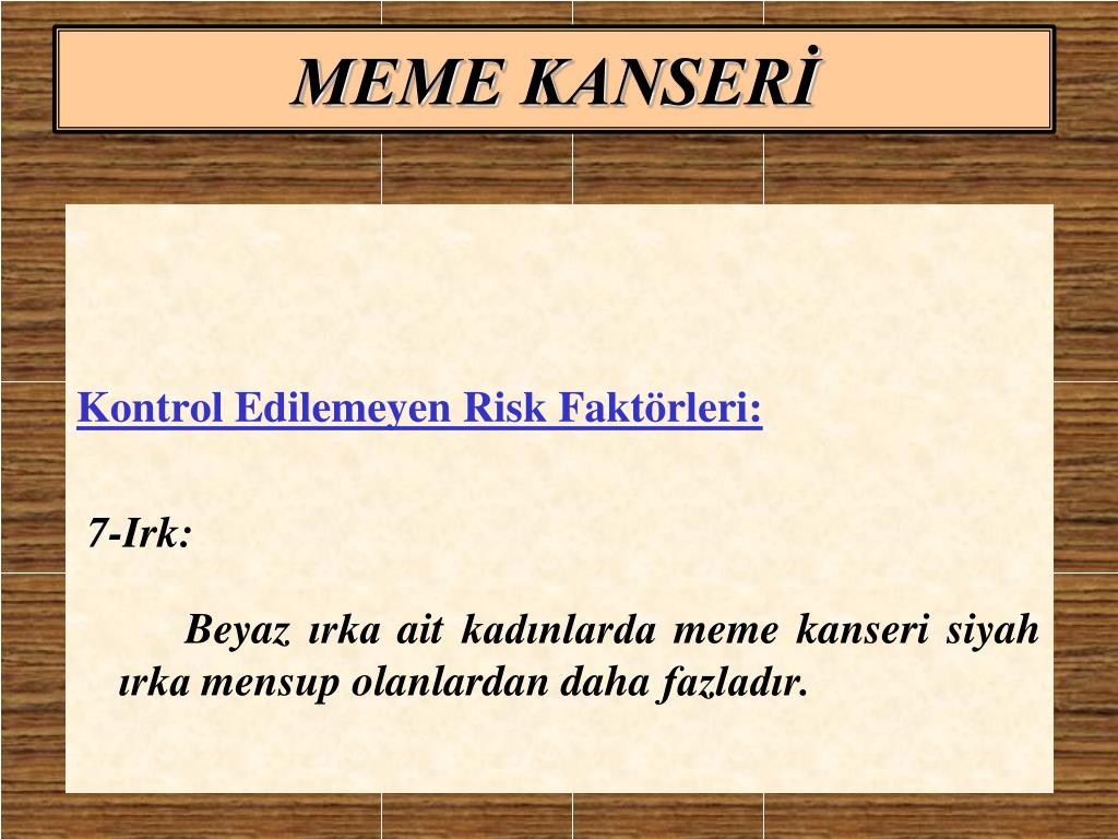 MEME KANSERİ Kontrol Edilemeyen Risk Faktörleri: 7-Irk: Beyaz ırka ait kadınlarda meme kanseri siyah ırka mensup olanlardan daha fazladır.
