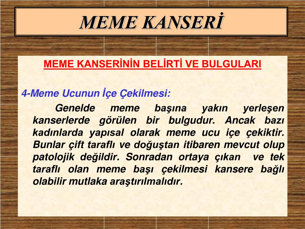 MEME KANSERİ MEME KANSERİNİN BELİRTİ VE BULGULARI 4-Meme Ucunun İçe Çekilmesi: Genelde meme başına yakın yerleşen kanserlerde görülen bir bulgudur.Ancak bazı kadınlarda yapısal olarak meme ucu içe çekiktir. Bunlar çift taraflı ve doğuştan itibaren mevcut olup patolojik değildir.Sonradan ortaya çıkan ve tek taraflı olan meme başı çekilmesi kansere bağlı olabilir mutlaka araştırılmalıdır.