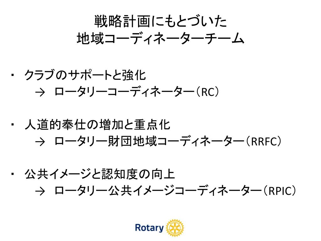 戦略計画にもとづいた地域コーディネーターチーム戦略計画にもとづいた地域コーディネーターチーム ・ クラブのサポートと強化 → ロータリーコーディネーター(RC) ・ 人道的奉仕の増加と重点化 → ロータリー財団地域コーディネーター(RRFC) ・ 公共イメージと認知度の向上 → ロータリー公共イメージコーディネーター(RPIC)