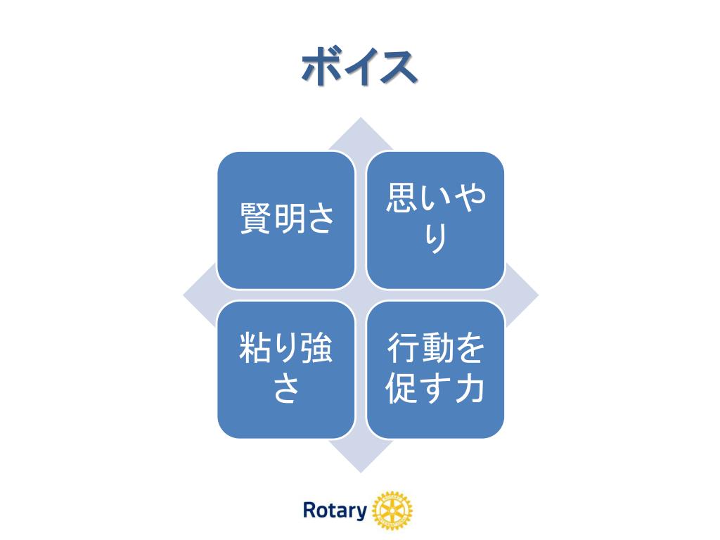 価値観を行動として表現 価値観価値観をどう実践するか 親睦と世界理解 生涯にわたる友情をはぐくむ 倫理と高潔さ 約束を守り抜く 多様性 多様な考え方を取り入れる 職業の専門性 リーダーシップと職業の 奉仕とリーダーシップ 専門知識を生かして地 域社会の問題に取り組む