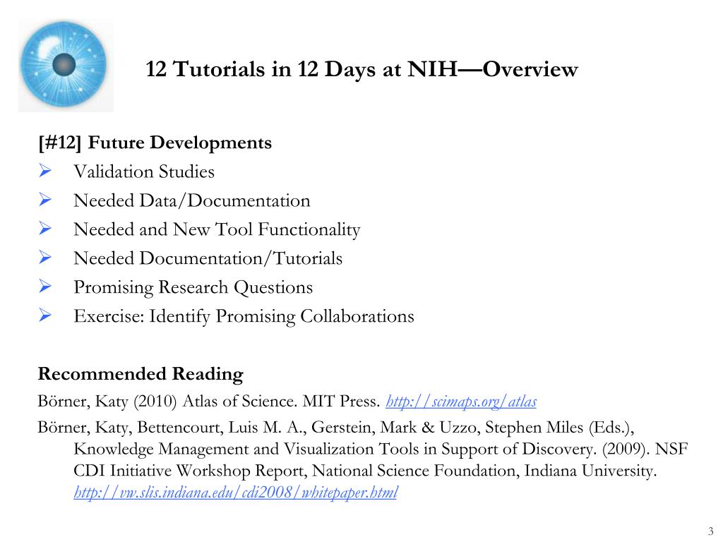 [#12] Future Developments Validation Studies Needed Data/Documentation Needed and New Tool Functionality Needed Documentation/Tutorials Promising Research Questions Exercise: Identify Promising Collaborations Recommended Reading Börner, Katy (2010) Atlas of Science. MIT Press. http://scimaps.org/atlas Börner, Katy, Bettencourt, Luis M. A., Gerstein, Mark & Uzzo, Stephen Miles (Eds.), Knowledge Management and Visualization Tools in Support of Discovery. (2009). NSF CDI Initiative Workshop Report, National Science Foundation, Indiana University. http://vw.slis.indiana.edu/cdi2008/whitepaper.html 12 Tutorials in 12 Days at NIH—Overview 3