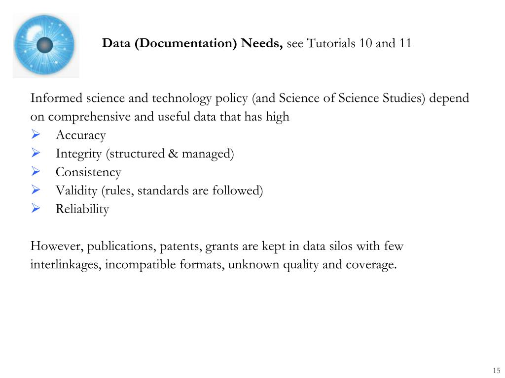 Informed science and technology policy (and Science of Science Studies) depend on comprehensive and useful data that has high Accuracy Integrity (structured & managed) Consistency Validity (rules, standards are followed) Reliability However, publications, patents, grants are kept in data silos with few interlinkages, incompatible formats, unknown quality and coverage. Data (Documentation) Needs, see Tutorials 10 and 11 15
