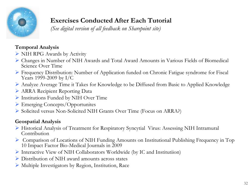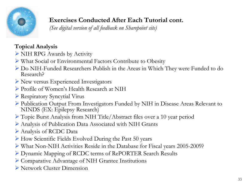 Temporal Analysis NIH RPG Awards by Activity Changes in Number of NIH Awards and Total Award Amounts in Various Fields of Biomedical Science Over Time Frequency Distribution: Number of Application funded on Chronic Fatigue syndrome for Fiscal Years 1999-2009 by I/C Analyze Average Time it Takes for Knowledge to be Diffused from Basic to Applied Knowledge ARRA Recipient Reporting Data Institutions Funded by NIH Over Time Emerging Concepts/Opportunites Solicited versus Non-Solicited NIH Grants Over Time (Focus on ARRA?) Geospatial Analysis Historical Analysis of Treatment for Respiratory Syncytial Virus: Assessing NIH Intramural Contribution Comparison of Locations of NIH Funding Amounts on Institutional Publishing Frequency in Top 10 Impact Factor Bio-Medical Journals in 2009 Interactive View of NIH Collaborators Worldwide (by IC and Institutiion) Distribution of NIH award amounts across states Multiple Investigators by Region, Institution, Race Exercises Conducted After Each Tutorial(See digital version of all feedback on Sharepoint site) 32