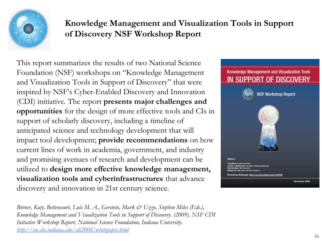 This report summarizes the results of two National Science Foundation (NSF) workshops on “Knowledge Management and Visualization Tools in Support of Discovery” that were inspired by NSF’s Cyber-Enabled Discovery and Innovation (CDI) initiative. The report presents major challenges and opportunities for the design of more effective tools and CIs in support of scholarly discovery, including a timeline of anticipated science and technology development that will impact tool development; provide recommendations on how current lines of work in academia, government, and industry and promising avenues of research and development can be utilized to design more effective knowledge management, visualization tools and cyberinfrastructures that advance discovery and innovation in 21st century science. Börner, Katy, Bettencourt, Luis M. A., Gerstein, Mark & Uzzo, Stephen Miles (Eds.), Knowledge Management and Visualization Tools in Support of Discovery. (2009). NSF CDI Initiative Workshop Report, National Science Foundation, Indiana University.http://vw.slis.indiana.edu/cdi2008/whitepaper.html Knowledge Management and Visualization Tools in Support of Discovery NSF Workshop Report 36