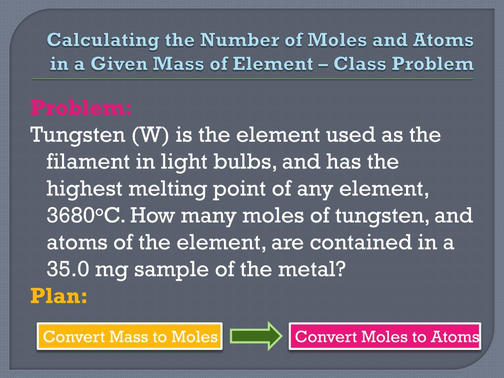 Calculating the Number of Moles and Atoms in a Given Mass of Element – Class Problem Convert Mass to Moles Convert Moles to Atoms Problem: Tungsten (W) is the element used as the filament in light bulbs, and has the highest melting point of any element, 3680oC. How many moles of tungsten, and atoms of the element, are contained in a 35.0 mg sample of the metal? Plan: