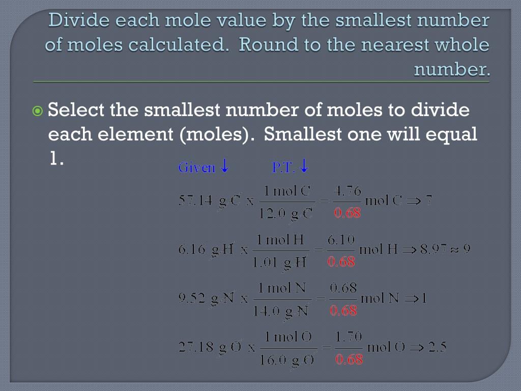Divide each mole value by the smallest number of moles calculated. Round to the nearest whole number. Select the smallest number of moles to divide each element (moles). Smallest one will equal 1.
