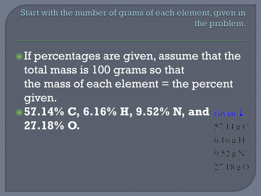 Start with the number of grams of each element, given in the problem. If percentages are given, assume that the total mass is 100 grams so that the mass of each element = the percent given. 57.14% C, 6.16% H, 9.52% N, and 27.18% O.