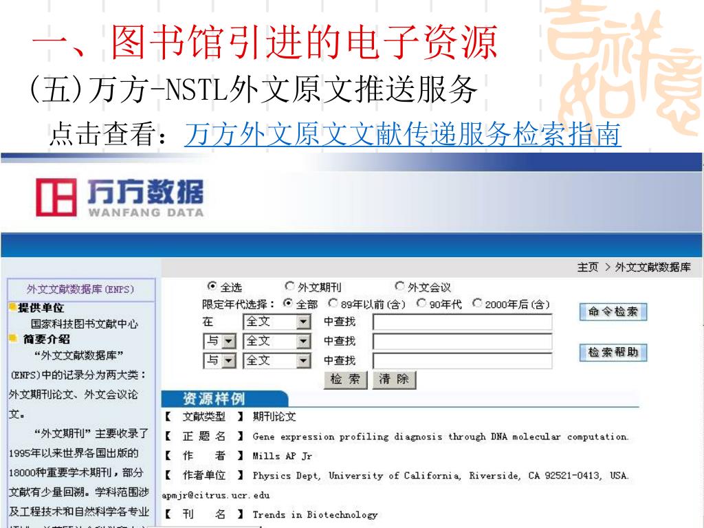 一、图书馆引进的电子资源 (五)万方-NSTL外文原文推送服务 “外文文献数据库”(ENPS)中的记录分为两大类:外文期刊论文、外文会议论文。“外文期刊”主要收录了1995年以来世界各国出版的18000种重要学术期刊,部分文献有少量回溯。学科范围涉及工程技术和自然科学各专业领域,并兼顾社会科学和人文科学。每年增加论文约百万余篇。“外文会议论文”主要收录了1985年以来世界各主要学协会、出版机构出版的学术会议论文,部分文献有少量回溯。学科范围涉及工程技术和自然科学各专业领域。每年增加论文约20余万篇。