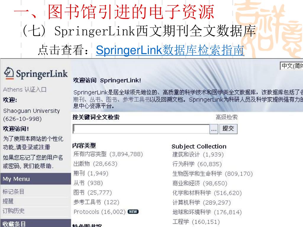 一、图书馆引进的电子资源 (七) SpringerLink西文期刊全文数据库 点击查看:SpringerLink数据库检索指南