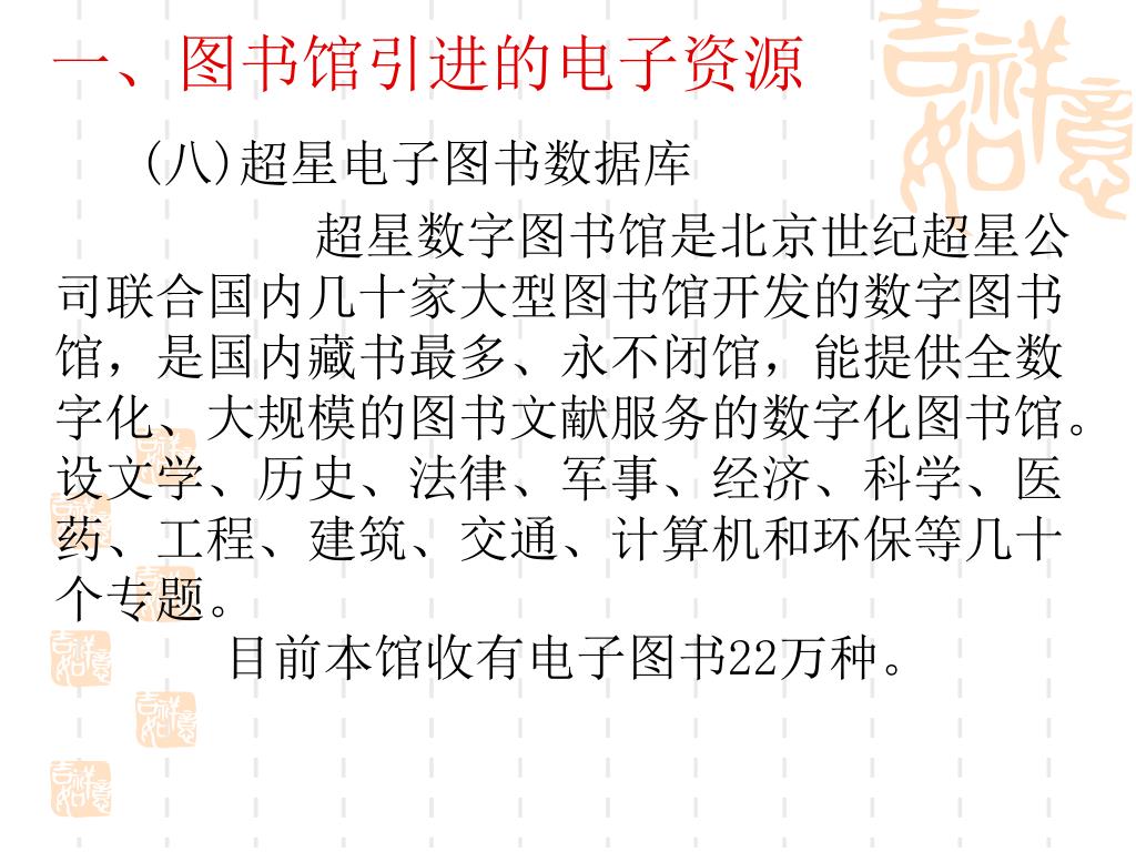 一、图书馆引进的电子资源 (八)超星电子图书数据库 超星数字图书馆是北京世纪超星公司联合国内几十家大型图书馆开发的数字图书馆,是国内藏书最多、永不闭馆,能提供全数字化、大规模的图书文献服务的数字化图书馆。设文学、历史、法律、军事、经济、科学、医药、工程、建筑、交通、计算机和环保等几十个专题。 目前本馆收有电子图书22万种。