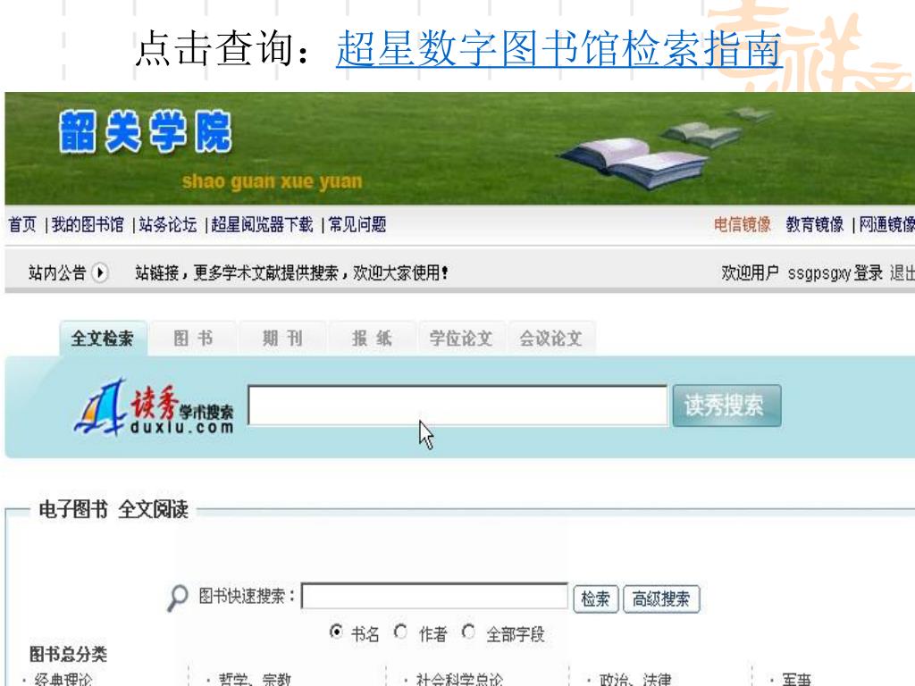 超星电子图书数据库 读秀(可免费使用一年) 全球最大的图书搜索以及文献传递系统平台。涵括内容有230多万种书目原数据、2亿多条目次、6亿多页全文资料、80多万位人物库等,并将这些资源组合成一本“超大的百科全书”。提供书目、全文等检索方式,并将每个检索点与馆藏纸质资源、馆藏电子资源、中图分类法、人物库等进行联合检索,读者可以通过任一知识点来进行联合跨库检索,一目了然地看到任何一个检索点检索结果的资源分布情况,能方便、快捷地选择到最适合自己获取知识来源的途径。