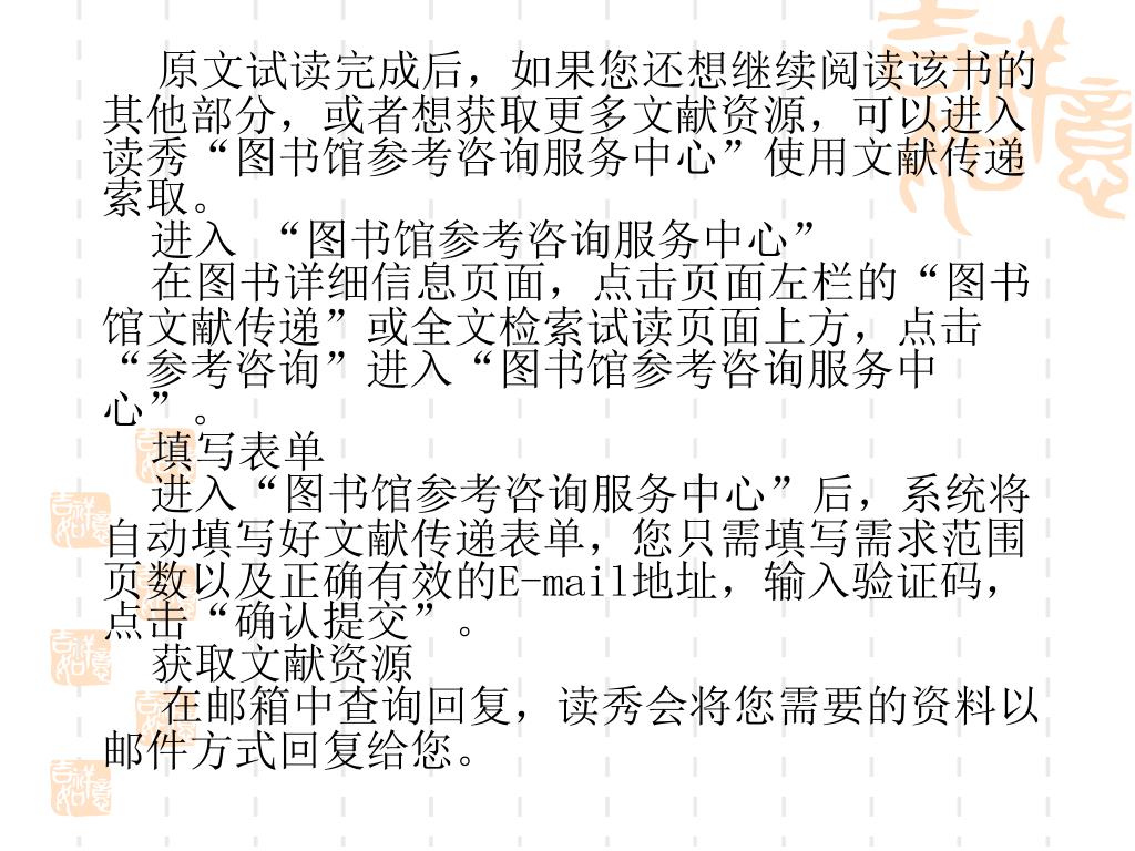 原文试读完成后,如果您还想继续阅读该书的其他部分,或者想获取更多文献资源,可以进入读秀“图书馆参考咨询服务中心”使用文献传递索取。进入 “图书馆参考咨询服务中心” 在图书详细信息页面,点击页面左栏的“图书馆文献传递”或全文检索试读页面上方,点击“参考咨询”进入“图书馆参考咨询服务中心”。填写表单进入“图书馆参考咨询服务中心”后,系统将自动填写好文献传递表单,您只需填写需求范围页数以及正确有效的E-mail地址,输入验证码,点击“确认提交”。获取文献资源 在邮箱中查询回复,读秀会将您需要的资料以邮件方式回复给您。