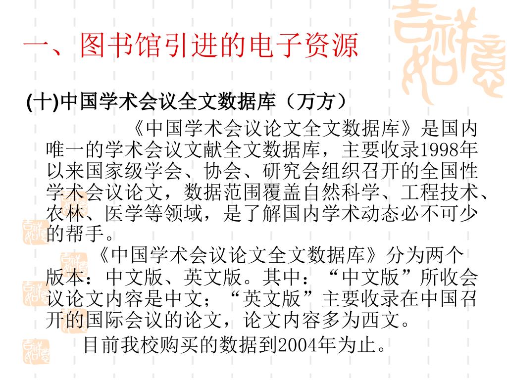 一、图书馆引进的电子资源 (十)中国学术会议全文数据库(万方) 《中国学术会议论文全文数据库》是国内唯一的学术会议文献全文数据库,主要收录1998年以来国家级学会、协会、研究会组织召开的全国性学术会议论文,数据范围覆盖自然科学、工程技术、农林、医学等领域,是了解国内学术动态必不可少的帮手。《中国学术会议论文全文数据库》分为两个版本:中文版、英文版。其中:“中文版”所收会议论文内容是中文;“英文版”主要收录在中国召开的国际会议的论文,论文内容多为西文。 目前我校购买的数据到2004年为止。