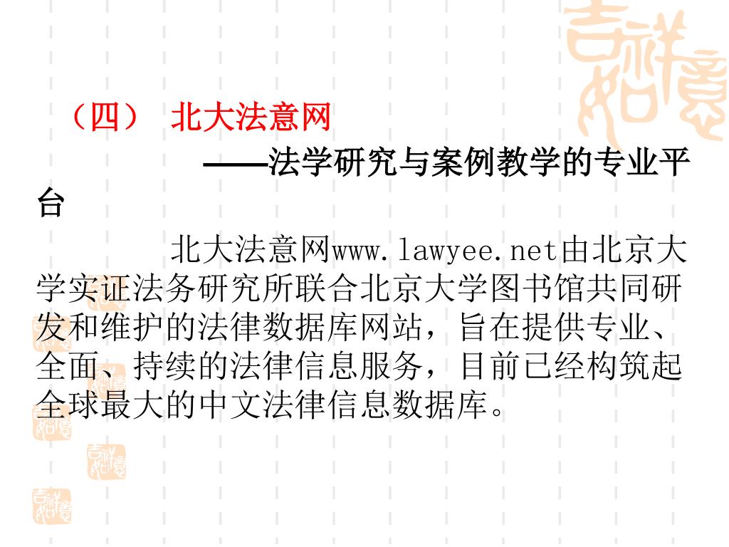(四)北大法意网 ——法学研究与案例教学的专业平台 北大法意网www.lawyee.net由北京大学实证法务研究所联合北京大学图书馆共同研发和维护的法律数据库网站,旨在提供专业、全面、持续的法律信息服务,目前已经构筑起全球最大的中文法律信息数据库。