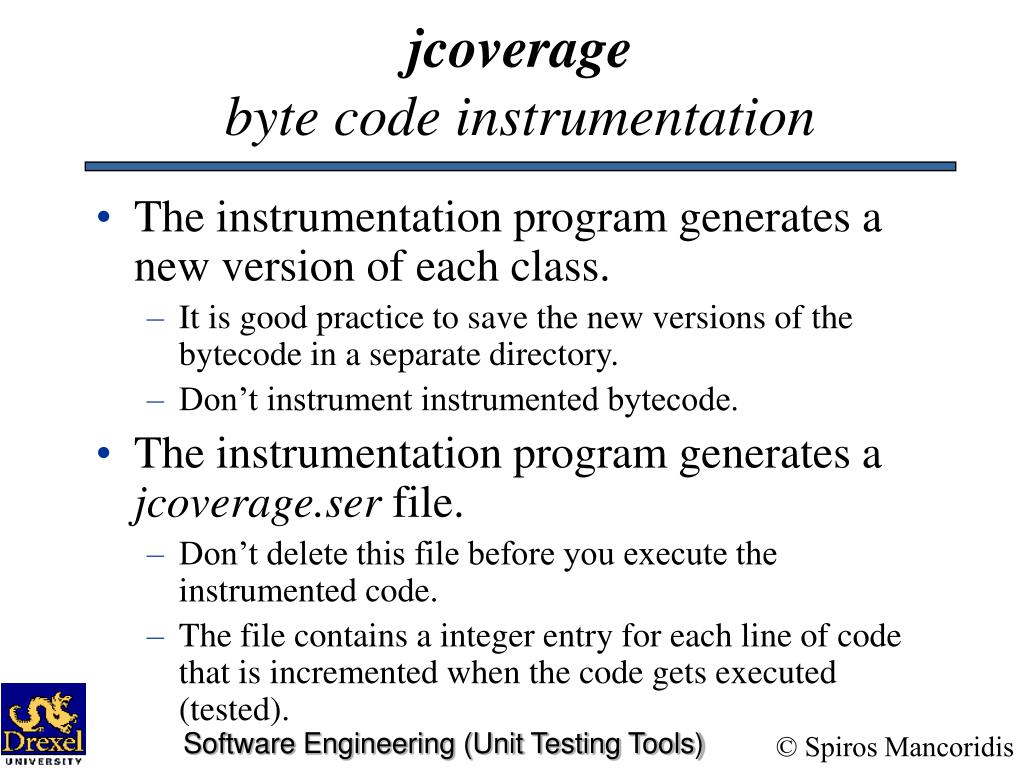 jcoveragebyte code instrumentation • The instrumentation program generates a new version of each class. • It is good practice to save the new versions of the bytecode in a separate directory. • Don’t instrument instrumented bytecode. • The instrumentation program generates a jcoverage.ser file. • Don’t delete this file before you execute the instrumented code. • The file contains a integer entry for each line of code that is incremented when the code gets executed (tested). Software Engineering (Unit Testing Tools)