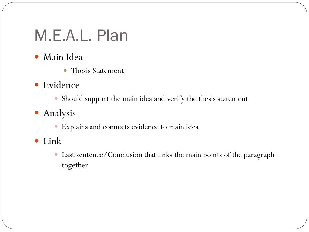 M.E.A.L. Plan • Main Idea • Thesis Statement • Evidence • Should support the main idea and verify the thesis statement • Analysis • Explains and connects evidence to main idea • Link • Last sentence/Conclusion that links the main points of the paragraph together