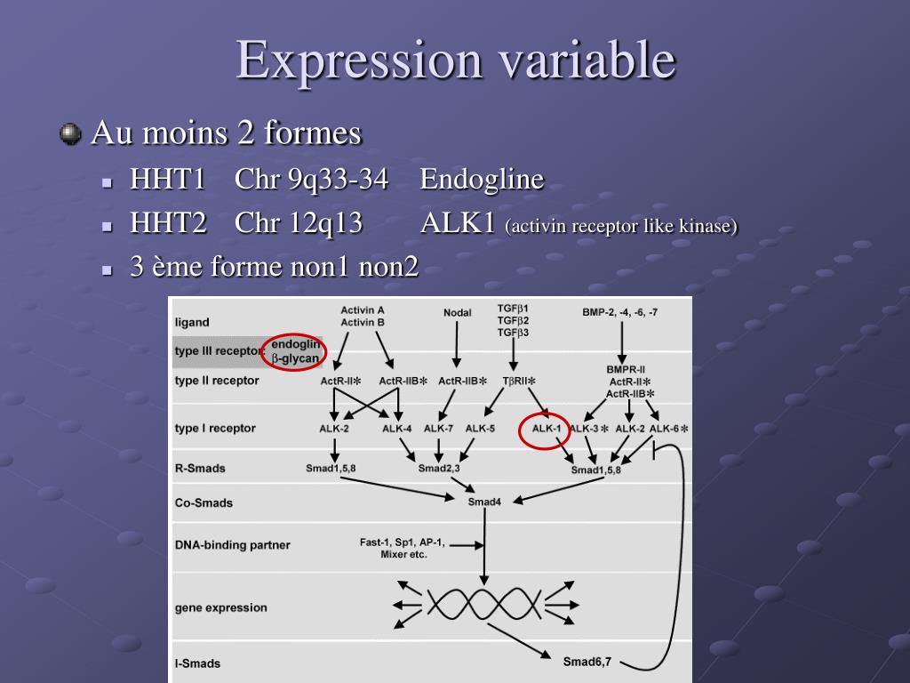 Expression variable • Au moins 2 formes • HHT1 Chr 9q33-34 Endogline • HHT2 Chr 12q13 ALK1 (activin receptor like kinase) • 3 ème forme non1 non2