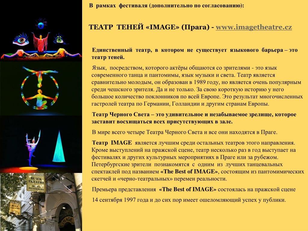 В рамках фестиваля (дополнительно по согласованию): ТЕАТР ТЕНЕЙ «IMAGE» (Прага) - www.imagetheatre.cz Единственный театр, в котором не существует языкового барьера – это театр теней. Язык, посредством, которого актёры общаются со зрителями - это язык современного танца и пантомимы, язык музыки и света. Театр является сравнительно молодым, он образован в 1989 году, но является очень популярным среди чешского зрителя. Да и не только. За свою короткую историю у него большое количество поклонников по всей Европе. Это результат многочисленных гастролей театра по Германии, Голландии и другим странам Европы. Театр Черного Света – это удивительное и незабываемое зрелище, которое заставит восхищаться всех присутствующих в зале. В мире всего четыре Театра Черного Света и все они находятся в Праге. ТеатрIMAGE является лучшим среди остальных театров этого направления. Кроме выступлений на пражской сцене, театр несколько раз в год выступает на фестивалях и других культурных мероприятиях в Праге или за рубежом. Петербургские зрители познакомятся с одним из лучших танцевальных спектаклей под названием «TheBestof IMAGE», состоящим из пантомимических скетчей и «черно-театральных» перемен реальности. Премьера представления «TheBestof IMAGE»состоялась на пражской сцене 14 сентября 1997 года и до сих пор имеет ошеломляющий успех у публики.