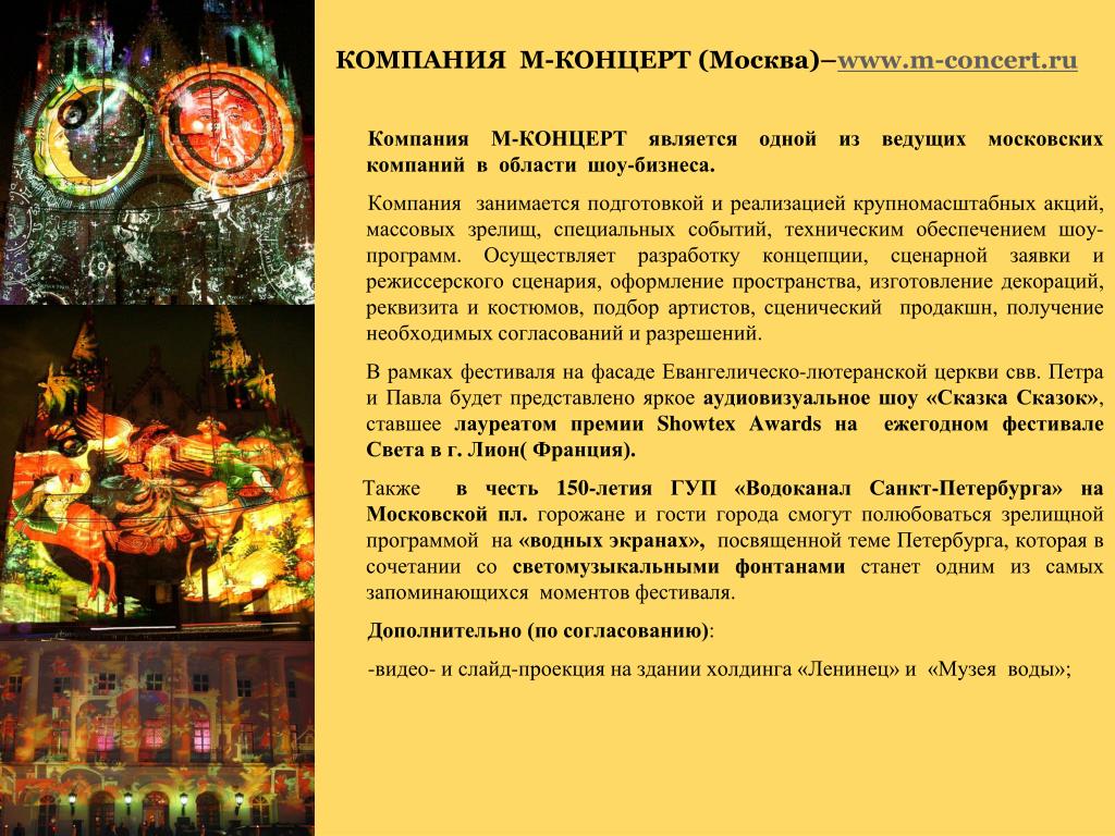 КОМПАНИЯ М-КОНЦЕРТ (Москва)–www.m-concert.ru КомпанияМ-КОНЦЕРТ является одной из ведущих московских компаний в области шоу-бизнеса. Компания занимается подготовкой и реализацией крупномасштабных акций, массовых зрелищ, специальных событий, техническим обеспечением шоу-программ. Осуществляет разработку концепции, сценарной заявки и режиссерского сценария, оформление пространства, изготовление декораций, реквизита и костюмов, подбор артистов, сценический продакшн, получение необходимых согласований и разрешений. В рамках фестиваля на фасаде Евангелическо-лютеранской церкви свв. Петра и Павла будет представлено яркое аудиовизуальное шоу «Сказка Сказок», ставшее лауреатом премии Showtex Awards на ежегодном фестивале Света в г. Лион( Франция). Также в честь 150-летия ГУП «Водоканал Санкт-Петербурга» на Московской пл. горожане и гости города смогут полюбоваться зрелищной программой на «водных экранах», посвященной теме Петербурга, которая в сочетании со светомузыкальными фонтанамистанет одним из самых запоминающихся моментов фестиваля. Дополнительно (по согласованию): -видео- и слайд-проекция на здании холдинга «Ленинец» и «Музея воды»;