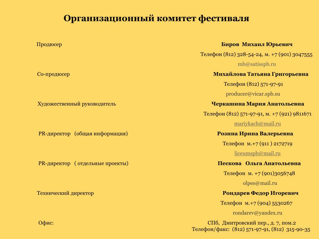 Организационный комитет фестиваля Продюсер Биров Михаил Юрьевич Телефон (812) 328-54-24, м. +7 (901) 3047555 mb@satisspb.ru Со-продюсерМихайлова Татьяна Григорьевна Телефон (812) 571-97-91 producer@vicar.spb.su Художественный руководитель Черкашина Мария Анатольевна Телефон (812) 571-97-91, м. +7 (921) 9811671 mariykach@mail.ru PR-директор (общая информация) Розина Ирина Валерьевна Телефон м.+7 (911 ) 2172719 liceumspb@mail.ru PR-директор ( отдельные проекты) Пескова Ольга Анатольевна Телефон м. +7 (901)3056748 olpes@mail.ru Технический директор Рондарев Федор Игоревич Телефон м.+7 (904) 5530267 rondarev@yandex.ru Офис: CПб, Дмитровский пер., д. 7, пом.2 Телефон/факс: (812) 571-97-91, (812) 315-90-35