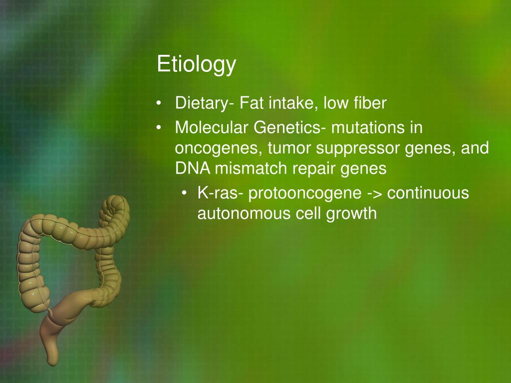 Etiology • Dietary- Fat intake, low fiber • Molecular Genetics- mutations in oncogenes, tumor suppressor genes, and DNA mismatch repair genes • K-ras- protooncogene -> continuous autonomous cell growth