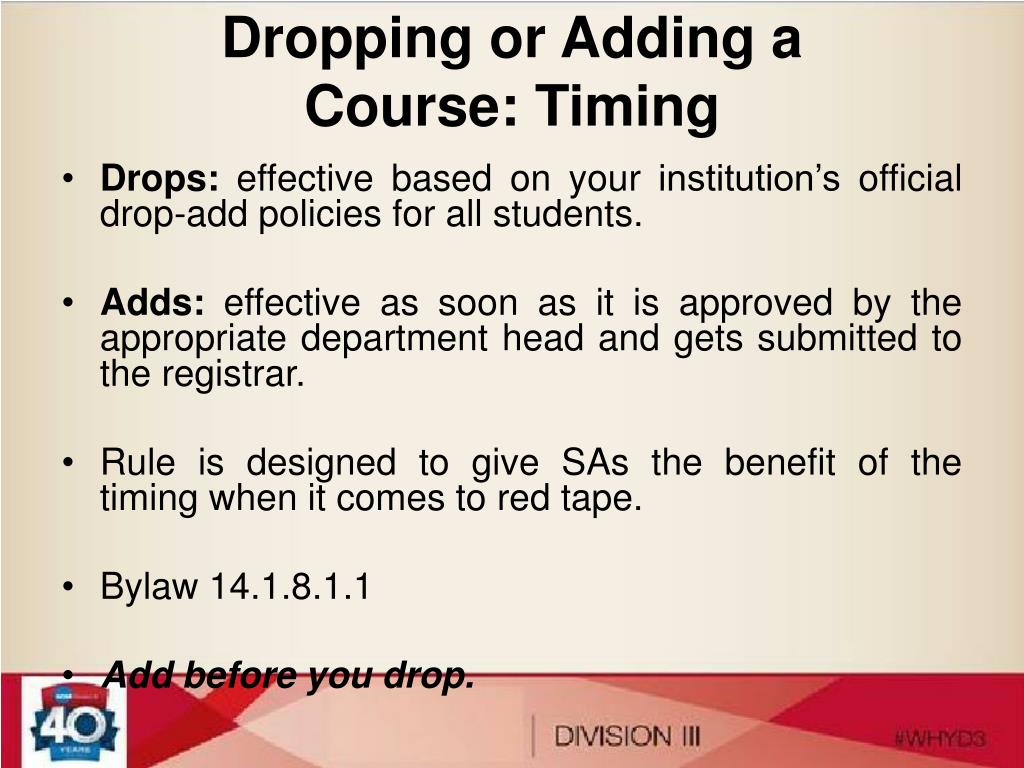 Dropping or Adding a Course: Timing Drops: effective based on your institution’s official drop-addpolicies for all students. Adds: effective as soon as it is approved by the appropriate department head and gets submitted to the registrar. Rule is designed to give SAs the benefit of the timing when it comes to red tape. Bylaw 14.1.8.1.1 Add before you drop.