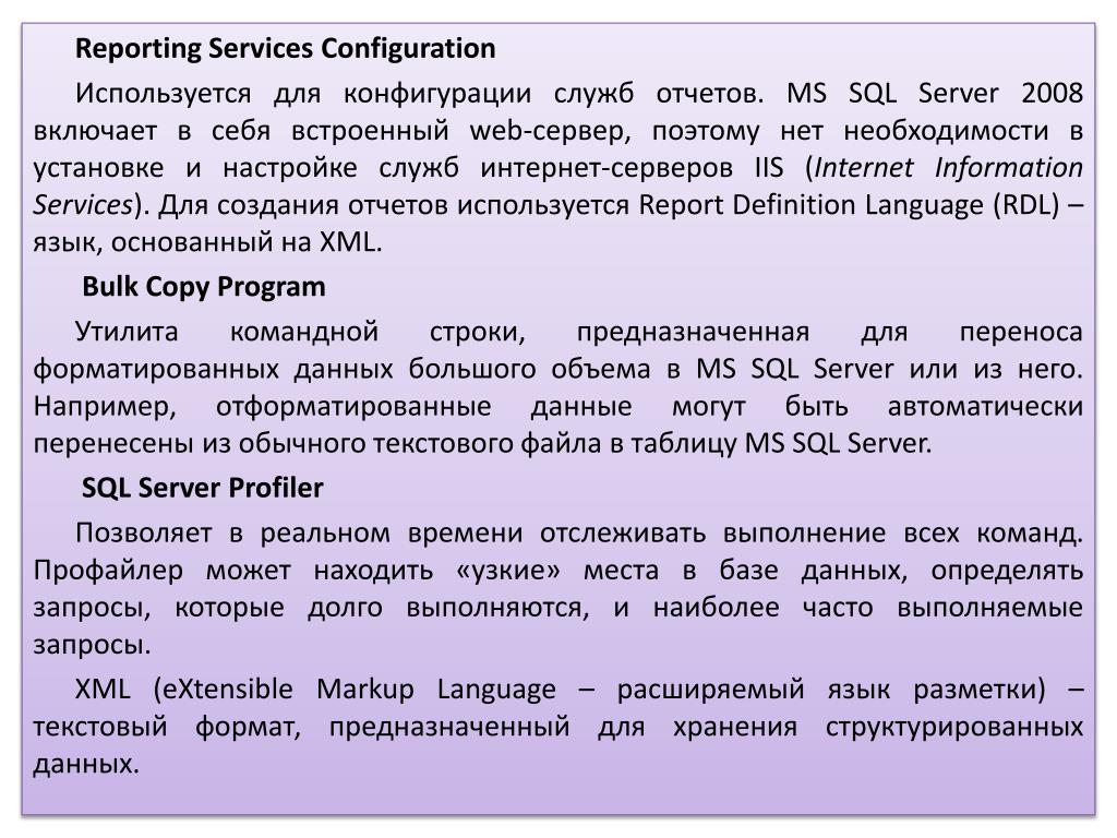 Reporting Services Configuration Используется для конфигурации служб отчетов. MS SQL Server 2008 включает в себя встроенный web-сервер, поэтому нет необходимости в установке и настройке служб интернет-серверов IIS (Internet Information Services). Для создания отчетов используется Report Definition Language (RDL) – язык, основанный на XML. Bulk Copy Program Утилита командной строки, предназначенная для переноса форматированных данных большого объема в MS SQL Server или из него. Например, отформатированные данные могут быть автоматически перенесены из обычного текстового файла в таблицу MS SQL Server. SQL Server Profiler Позволяет в реальном времени отслеживать выполнение всех команд. Профайлер может находить «узкие» места в базе данных, определять запросы, которые долго выполняются, и наиболее часто выполняемые запросы. XML (eXtensible Markup Language – расширяемый язык разметки) – текстовый формат, предназначенный для хранения структурированных данных.